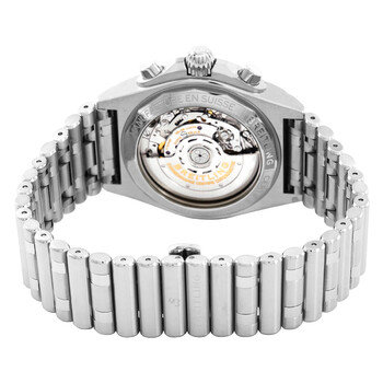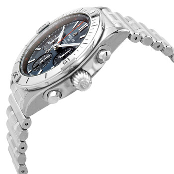 Silver-tone stainless steel case and bracelet. Uni-directional rotating stainless steel bezel. Blue dial with luminous silver-tone hands and index hour markers. Minute markers. 1/100th second markers. Tachymeter markings around the outer rim. Dial Type: Analog. Luminescent hands and markers. Date display at the 6 o'clock position. Chronograph - three sub-dials displaying: 60 second, 30 minute and 12 hour. Breitling Calibre 01 Automatic movement, containing 47 Jewels, composed of 346 parts, bitting at 28800 vph, and has a power reserve of approximately 70 hours. Scratch resistant sapphire crystal. Screw locked crown. Transparent case back. Round case shape, case size: 42 mm, case thickness: 15.10 mm. Band width: 22 / 20 mm. Fold over clasp with a push button release. Water resistant at 200 meters / 660 feet. Functions: chronograph, tachymeter, date, hour, minute, second. Chronomat B01 42 Series. Luxury watch style. Watch label: Swiss Made. Breitling Chronomat B01 42 Chronograph Automatic Blue Dial Men's Watch AB0134101C1A1.