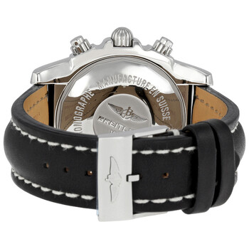Stainless steel case with a black leather strap. Unidirectional rotating stainless steel bezel. Grey dial with luminous hands and index hour markers. Minute markers. Tachymeter around the outer rim. Dial Type: Analog. Luminescent hands and markers. Date display between the 4 and 5 o'clock positions. Chronograph - three sub-dials displaying: 12 hours, 30 minutes and 60 seconds. Breitling calibre 01 automatic movement with a 70-hour power reserve. Scratch resistant sapphire crystal. Screw locked crown. Solid case back. Round case shape. Case size: 43.5 mm. Case thickness: 16.95 mm. Band width: 22 mm.Tang clasp. Water resistant at 500 meters / 1650 feet. Functions: chronograph, chronometer, date, hour, minute, second, tachymeter. Sport watch style. Watch label: Swiss Made. Breitling Chronomat B01 Chronograph Automatic Chronometer Men's Watch AB011012/F546.
