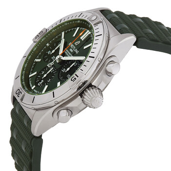 Silver-tone stainless steel case with a green rubber strap. Uni-directional rotating silver-tone stainless steel bezel. Green dial with silver-tone hands and index hour markers. Minute markers around the outer rim. Dial Type: Analog. Luminescent hands and markers. Date display at the 6 o'clock position. Chronograph - three sub-dials displaying: 60 second, 30 minute and 1/10th of a second. Breitling Calibre 01 Automatic movement, containing 47 Jewels, composed of 346 parts, bitting at 28800 vph, and has a power reserve of approximately 70 hours. Scratch resistant sapphire crystal. Screw down crown. Transparent see through case back. Round case shape, case size: 42 mm, case thickness: 15.1 mm. Band width: 22 mm. Folding clasp. Water resistant at 200 meters / 660 feet. Functions: chronograph, date, hour, minute, second. B01 Series. Sport watch style. Watch label: Swiss Made. Breitling B01 Chronograph Automatic Green Dial Men's Watch AB0134101L2S1.