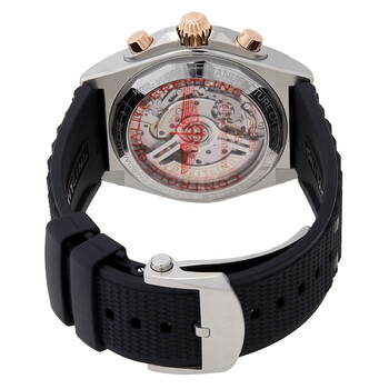 Stainless steel & 18kt rose gold case with a black rubber strap. Uni-directional rotating rose gold-tone stainless steel & 18kt rose gold bezel. Grey dial with rose gold-tone hands and index hour markers. Minute markers around the outer rim. Dial Type: Analog. Luminescent hands and markers. Date display at the 6 o'clock position. Chronograph - three sub-dials displaying: 60 second, 30 minute and 1/10th of a second. Breitling Calibre 01 Automatic movement, containing 47 Jewels, composed of 346 parts, bitting at 28800 vph, and has a power reserve of approximately 70 hours. Scratch resistant sapphire crystal. Screw down crown. Transparent see through case back. Round case shape, case size: 42 mm, case thickness: 15.1 mm. Band width: 22 mm. Folding clasp. Water resistant at 200 meters / 660 feet. Functions: chronograph, date, hour, minute, second. B01 Series. Sport watch style. Watch label: Swiss Made. Breitling B01 Chronograph Automatic Grey Dial Men's Watch UB0134101B1S1.