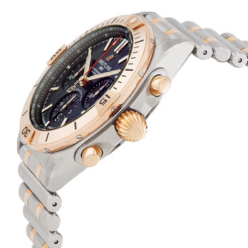 Silver-tone stainless steel case. Stainless steel bracelet with 18kt rose gold links. Uni-directional rotating 18kt rose gold bezel. Black mother of pearl dial with rose gold-tone hands and index hour markers. Minute markers around the outer rim. Dial Type: Analog. Luminescent hands and markers. Date display at the 6 o'clock position. Chronograph - three sub-dials displaying: 60 second, 30 minute and 12 hour. Breitling Calibre 01 Automatic movement, containing 47 Jewels, composed of 346 parts, bitting at 28800 vph, and has a power reserve of approximately 70 hours. Scratch resistant sapphire crystal. Screw down crown. Transparent case back. Round case shape, case size: 42 mm, case thickness: 15.1 mm. Band width: 22 mm. Fold over clasp with a push button release. Water resistant at 200 meters / 660 feet. Functions: chronograph, column wheel, date, hour, minute, second, chronometer. Chronomat B01 Series. Luxury watch style. Watch label: Swiss Made. Breitling Chronomat B01 Chronograph Automatic Men's Watch UB01341A1B1U1.