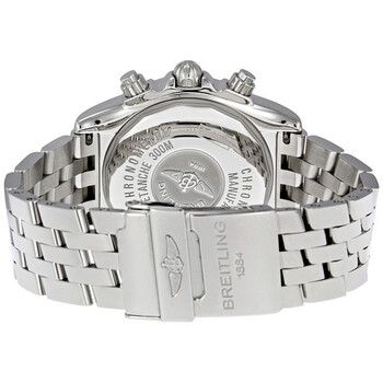 Silver-tone stainless steel case with a silver-tone stainless steel bracelet. Fixed silver-tone bezel with diamond set. Beige dial with luminous hands and Roman numeral hour markers. Minute markers. tachymeter scale appears around the outer rim. Dial Type: Analog. Luminescent hands and markers. Date display at the 3 o'clock position. Chronograph - three sub-dials displaying: 60 second, 30 minute and 12 hour. Breitling Calibre 13 Automatic movement, based upon ETA Valjoux 7750, containing 25 Jewels, bitting at 28800 vph, and has a power reserve of approximately 42 hours. Scratch resistant glareproof sapphire crystal. Screw locked crown. Screw in case back. Round case shape, case size: 43.70 mm, case thickness: 17.1 mm. Band width: 22-20 mm. Deployment clasp. Water resistant at 300 meters / 1000 feet. Functions: chronograph, chronometer, date, hour, minute, second, tachymeter. Windrider Chronomat Series. Dive watch style. Watch label: Swiss Made. Breitling Chronomat Beige Dial Diamond Bezel Men's Watch A1335653-A653S.