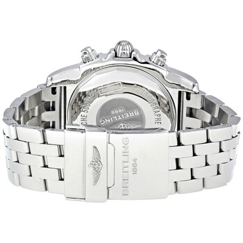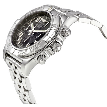 Stainless steel case with a stainless steel bracelet. Uni-directional rotating stainless steel bezel. Black dial with silver-tone hands and Roman numeral hour markers. Minute markers. 1/100th scale. Tachymeter around the outer rim. Dial Type: Analog. Luminescent hands and markers. Date display appears between the 4 and 5 o'clock position. Chronograph - three sub-dials displaying: 60 second, 30 minute and 12 hour. Automatic movement with a 70 hour power reserve. Scratch resistant sapphire crystal. Screw down crown. Solid case back. Case diameter: 43.5 mm. Case thickness: 17 mm. Fold over clasp with safety release. Water resistant at 500 meters / 1650 feet. Functions: chronograph, date, hour, minute, second. Luxury watch style. Breitling Chronomat Black Stainless Steel Automatic Men's Watch AB011012-B956SS.