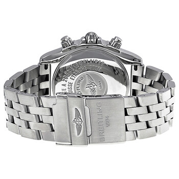 Stainless steel case with a stainless steel bracelet. Bi-directional rotating stainless steel bezel. Black dial with silver-tone hands and stick hour markers. Minute markers. Tachymeter markers around the outer rim. Dial Type: Analog. Luminescent hands and markers. Date display at the 12 o'clock position. Chronograph - three sub-dials displaying: 60 second, 30 minute and 12 hour. Automatic movement with 42 hour power reserve. Scratch resistant sapphire crystal. Screw down crown. Solid case back. Case diameter: 44 mm. Case thickness: 17 mm. Round case shape. Band width: 22 mm. Fold over clasp with a safety release. Water resistant at 300 meters / 1000 feet. Functions: chronograph, date, hour, minute, second. Luxury watch style. Watch label: Swiss Made. Breitling Chronomat BlackBird Automatic Chronograph Black Dial Men's Watch A4436010-BB71SS.