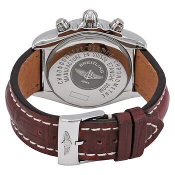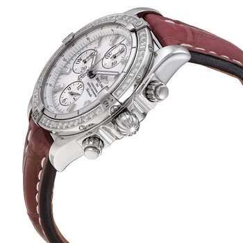 Silver-tone stainless steel case with a burgundy crocodile leather strap. Uni-directional rotating bezel. Mother of pearl dial with silver-tone hands and diamond hour markers. Tachymeter. Dial Type: Analog. Date display at the 3 o'clock position. Chronograph - three sub-dials displaying: 60 second, 30 minute and 12 hours. Automatic movement. Scratch resistant sapphire crystal. Screw down crown. Round case shape, case size: 43.7 mm, case thickness: 17.10 mm. Tang clasp. Water resistant at 300 meters / 1000 feet. Functions: chronograph, date, hour, minute, second. Chronomat Calibre 13 Series. Luxury watch style. Watch label: Swiss Made. Breitling Chronomat Calibre 13 Chronograph Automatic Diamond Watch A1335653/A570.735P.A20BA.1.