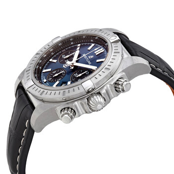 Stainless steel case with a black (alligator) leather strap. Uni-directional rotating stainless steel bezel. Blue dial with luminous silver-tone hands and index hour markers. Minute markers. 1/100th markers. Tachymeter markings around the outer rim. Dial Type: Analog. Luminescent hands and markers. Date display between the 4 and 5 o'clock positions. Chronograph - three sub-dials displaying: 60 second, 30 minute and 12 hour. Breitling calibre 01 automatic movement with a 70-hour power reserve. Scratch resistant sapphire crystal. Screw locked crown. Solid case back. Round case shape. Case size: 44 mm. Case thickness: 16.95 mm. Band width: 22 mm. Tang clasp. Water resistant at 500 meters / 1650 feet. Functions: chronograph, date, hour, minute, second, chronometer. Dive watch style. Watch label: Swiss Made. Item Variations: AB011510-CA01-743P-A20BASA.1. Breitling Chronomat Chronograph Automatic Chronometer Blue Dial Men's Watch AB0115101C1P2.
