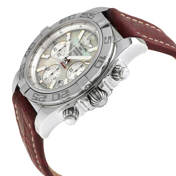 Stainless steel case with a burgundy (crocodile) leather strap. Uni-directional rotating stainless steel bezel. Mother of pearl dial with luminous silver-tone hands and index hour markers. Minute markers. 1/100th seconds markers. Tachymeter markings around the outer rim. Dial Type: Analog. Luminescent hands and markers. Date display between the 4 and 5 o'clock positions. Chronograph - three sub-dials displaying: 60 second, 30 minute and 12 hours. Breitling calibre B01 automatic movement with a 70-hour power reserve. Scratch resistant sapphire crystal. Screw down crown. Solid case back. Round case shape. Case size: 44 mm. Case thickness: 16.95 mm. Band width: 22 mm. Tang clasp. Water resistant at 500 meters / 1650 feet. Functions: chronograph, tachymeter, date, hour, minute, second. Luxury watch style. Watch label: Swiss Made. Breitling Chronomat Chronograph Automatic Mother of Pearl Dial Men's Watch AB011012/G685BGCT.