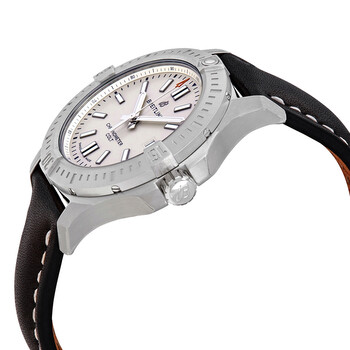 Stainless steel case with a black (calfskin) leather strap. Uni-directional rotating stainless steel bezel. Silver dial with luminous silver-tone hands and index hour markers. Minute markers. 1/100th second markers around the outer rim. Dial Type: Analog. Luminescent hands and markers. Date display at the 3 o'clock position. Breitling calibre 17 automatic movement, based upon ETA 2824-2, containing 25 Jewels, bitting at 28800 vph, and has a power reserve of approximately 42 hours. Scratch resistant sapphire crystal. Screw down crown. Solid case back. Round case shape. Case size: 41 mm. Case thickness: 12.40 mm. Band width: 22 mm. Tang clasp. Water resistant at 200 meters / 660 feet. Functions: date, hour, minute, second, chronometer. Luxury watch style. Watch label: Swiss Made. Item Variations: A1731310-G837-428X-A18BASA.1. Breitling Chronomat Colt Automatic Chronometer Silver Dial Men's Watch A17313101G1X1.
