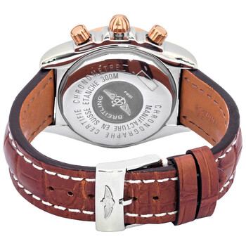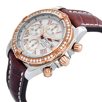 Stainless steel and 18 kt rose gold case with a brown leather strap. Uni-directional rotating bezel with diamond set. Silver dial with Roman numeral hour markers. Minute markers around the outer rim. Dial Type: Analog. Luminescent hands and markers. Date display at the 3 o'clock position. Chronograph - three sub-dials displaying: 60 second, 30 minute and 12 hour. Breitling Calibre 13 Automatic movement, based upon ETA Valjoux 7750, containing 25 Jewels, bitting at 28800 vph, and has a power reserve of approximately 42 hours. Scratch resistant sapphire crystal. Screw down crown. Solid case back. Round case shape, case size: 44 mm. Tang clasp. Water resistant at 300 meters / 1000 feet. Functions: chronograph, chronometer, date, hour, minute, second. Chronomat Evolution Series. Luxury watch style. Watch label: Swiss Made. Breitling Chronomat Evolution Chronograph Automatic Chronometer Diamond Silver Dial Men's Watch C1335653/A619.737P.A20BA.1.