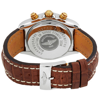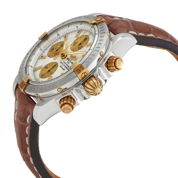 Silver-tone stainless steel case with a brown leather strap. Silver with champagne dial with gold-tone hands and index hour markers. Tachymeter. Dial Type: Analog. Date display at the 3 o'clock position. Chronograph - three sub-dials displaying: 60 second, 30 minute and 12 hours. Automatic movement. Scratch resistant sapphire crystal. Round case shape, case size: 43.7 mm. Tang clasp. Water resistant at 300 meters / 1000 feet. Functions: chronograph, date, hour, minute, second. Chronomat Evolution Series. Luxury watch style. Watch label: Swiss Made. Breitling Chronomat Evolution Chronograph Automatic Men's Watch B1335611/A571.739P.A20BA.