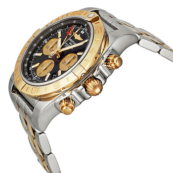 Stainless steel case with a stainless steel and 18 kt rose gold bracelet. Bi-directional rotating 18 kt rose gold bezel. Black dial with rose gold-tone hands and stick hour markers. Minute markers. Tachymeter around the outer rim. Dial Type: Analog. Luminescent hands and markers. Date display between 4 and 5 o'clock positions. Chronograph - three sub-dials displaying: 60 second, 30 minute and 12 hour. Automatic movement with 70 hour power reserve. Scratch resistant sapphire crystal. Screw locked crown. Solid case back. Case diameter: 44 mm. Case thickness: 16.9 mm. Round case shape. Band width: 22 mm. Fold over clasp with safety. Water resistant at 200 meters / 660 feet. Functions: chronograph, date, hour, minute, second. Luxury watch style. Watch label: Swiss Made. Breitling Chronomat GMT Automatic Chronograph Black Dial Men's Watch CB042012-BB86TT.