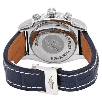 Silver-tone stainless steel case with a blue crocodile leather strap. Uni-directional rotating silver-tone stainless steel bezel. Blue dial with silver-tone hands and index hour markers. Minute markers around the outer rim. Dial Type: Analog. Luminescent hands and markers. Date display between 4 and 5 o'clock position. Chronograph - three sub-dials displaying: 60 second, 60 minute and 12 hour. Breitling Calibre 04 Automatic movement, based upon Breitling Calibre 01, containing 47 Jewels, bitting at 28000 vph, and has a power reserve of approximately 70 hours. Scratch resistant sapphire crystal. Screw down crown. Solid case back. Round case shape, case size: 47 mm. Band width: 24 mm. Deployment with push button release clasp. Water resistant at 500 meters / 1650 feet. Functions: chronograph, date, hour, minute, second, GMT, second time zone, chronometer. Chronomat Gmt Series. Luxury watch style. Watch label: Swiss Made. Breitling Chronomat GMT Chronograph Automatic Chronometer Blue Dial Men's Watch AB041012/BA69.761P.A20D.1.