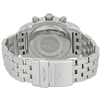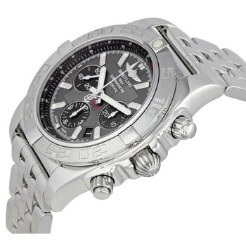 Stainless steel case with a stainless steel bracelet. Unidirectional ratcheted stainless steel bezel. Gray dial with luminous hands and stick hour markers. Minute markers. Tachymeter around the outer rim. Dial Type: Analog. Luminescent hands and markers. Date displays between the 4 and 5 o'clock position. Chronograph - three sub-dials displaying: 60 second, 30 minute and 12 hour. Self winding mechanical movement. Scratch resistant sapphire crystal. Screw locked crown with two gaskets. Screwed in case back. Case diameter: 43.70 mm. Case thickness: 17.10 mm. Round case shape. Deployment clasp. Water resistant at 300 meters/ 1000 feet. Functions: hours, minutes, seconds, date, chronograph, tachymeter. Sport watch style. Watch label: Swiss Made. Breitling Chronomat Grey Dial Men's Watch AB011011-F546SS.