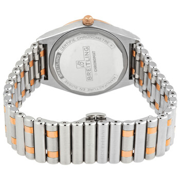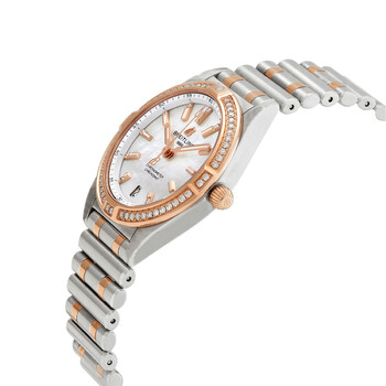 Stainless steel and 18kt rose gold case and bracelet. Fixed 18kt rose gold bezel set with diamonds. Mother of pearl dial with rose gold hands and diamond-index hour markers. Arabic numeral minute markers (at 5 minute intervals). Dial Type: Analog. Luminescent hands and markers. Date display at the 6 o'clock position. Breitling Calibre 77 quartz movement. Scratch resistant sapphire crystal. Pull / push crown. Solid case back. Round case shape, case size: 32 mm, case thickness: 8.5 mm. Band width: 16 mm. Folding clasp. Water resistant at 100 meters / 330 feet. Functions: date, hour, minute, second, chronometer. Chronomat Series. Luxury watch style. Watch label: Swiss Made. Breitling Chronomat Quartz Chronometer Diamond Mother of Pearl Dial Two-tone Ladies Watch U77310591A2U1.