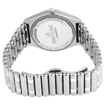 Stainless steel case with a stainless steel bracelet. Fixed stainless steel bezel. Pink dial with luminous silver-tone hands and diamond-tipped index hour markers. Arabic numeral minute markers (at 5 minute intervals). Minute markers around the outer rim. Dial Type: Analog. Luminescent hands and markers. Date display at the 6 o'clock position. Breitling calibre 77 quartz movement. Scratch resistant sapphire crystal. Pull / push crown. Solid case back. Round case shape. Case size: 32 mm. Case thickness: 8.5 mm. Band width: 16 mm. Fold over clasp. Water resistant at 100 meters / 330 feet. Functions: date, hour, minute, second, chronometer. Additional Info: original box, manual (complete accessories). Chronomat Series. Luxury watch style. Watch label: Swiss Made. Breitling Chronomat Quartz Chronometer Diamond Pink Dial Ladies Watch A77310101K1A1.