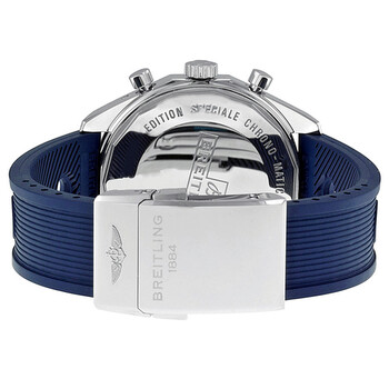 Stainless steel case with a blue rubber strap. Bi-directional rotating bezel. White dial with silver-tone hands and stick hour markers. Minute markers. Mile / kilometer conversion scale around the outer rim. Dial Type: Analog. Luminescent hands and markers. Chronograph - three dual function sub-dials displaying: 60 second / date, 30 minute / month and 12 hour / day of the week. Automatic movement with 42 hour power reserve. Scratch resistant sapphire crystal. Pull / push crown. Solid case back. Case diameter: 49 mm. Case thickness: 14.7 mm. Round case shape. Band width: 24 mm. Tang clasp. Water resistant at 30 meters / 100 feet. Functions: chronograph, month, day, date, hour, minute, second. Luxury watch style. Watch label: Swiss Made. Breitling Chrono-matic 1461 Automatic Chronograph Men's Watch A1936002-G683BLOR.