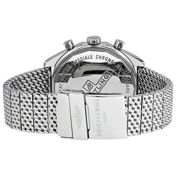 Silver-tone stainless steel case with a silver-tone stainless steel bracelet. Bi-directional rotating with slide rule black ion-plated stainless steel bezel. Silver dial with luminous hands and stick hour markers. Minute markers. conversion markings. Dial Type: Analog. Luminescent hands and markers. Date display at the 6 o'clock position. Chronograph - three sub-dials displaying: 60 second, 30 minute and 12 hour. Breitling Calibre 14 automatic movement with a 42-hour power reserve. Scratch resistant cambered glareproofed sapphire crystal. Screw locked crown. Solid case back. Round case shape, case size: 49 mm, case thickness: 14 mm. Band width: 24-20 mm. Deployment clasp. Water resistant at 30 meters / 100 feet. Functions: chronograph, date, hour, minute, second, chronometer, nautical miles conversion scale. Sport watch style. Watch label: Swiss Made. Breitling Chrono-Matic 49 Chronograph Men's Watch A1436002-G658SS.