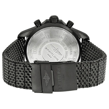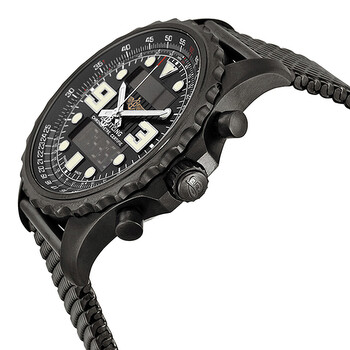 Black carbon base stainless steel case with a black carbon base stainless steel bracelet. Bi-directional rotating steel bezel. Black dial with black hands and dot hour markers. Arabic numerals mark the 3 and 9 o'clock positions Minute markers. Slide rule around the outer rim. Dial Type: Analog-digital. Luminescent hands and markers. Perpetual digital calendar. Superquartz movement. Breitling calibre 78 engine. Scratch resistant sapphire crystal. Pull / push crown. Solid case back. Case diameter: 48 mm. Case thickness: 15.2 mm. Round case shape. Fold over clasp with safety. Water resistant at 50 meters / 165 feet. Functions: chronograph, date, hour, minute, second. Additional Info: dual time zones, alarm, 12/24 hour formats, backlight, eol indicator. Luxury watch style. Watch label: Swiss Made. Breitling Chronospace Blacksteel Analog-Digital Multi-Function Men's Watch M7836522-BA26SS.