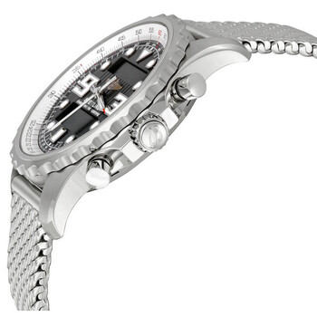 Stainless steel case with a stainless steel mesh bracelet. Bidirectional (pinion mechanism) stainless steel bezel. Black dial with luminous hands and dot hour markers. Oversized Arabic numerals mark the 9 and 3 o'clock positions. Minute markers. Digital perpetual calendar. Superquartz movement. Scratch resistant sapphire crystal. Non screw-locked crown - two gaskets (integrated pushpiece). Solid case back. Case diameter: 48 mm. Case thickness: 15.20 mm. Deployment clasp. Water resistant at 50 meters/ 165 feet. Functions: hours, minutes, seconds, calendar, alarm, countdown timer, 2nd timezone with independent alarm, universal time. Breitling Chronospace Men's Watch A7836534-BA26SS.