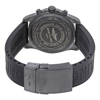 Black titanium case with a black rubber (Diver Pro III) strap. Uni-directional rotating black titanium bezel. Blue dial with luminous grey hands and Arabic numeral hour markers. Minute markers. 1/100th second markers around the outer rim. Dial Type: Analog. Luminescent hands and markers. Date display between the 4 and 5 o'clock positions. Chronograph - three sub-dials displaying: 60 second, 12 hours and 1/10th of a second. Breitling calibre 73 quartz movement. Scratch resistant sapphire crystal. Screw locked crown. Solid case back. Round case shape. Case size: 43 mm. Case thickness: 12.62 mm. Band width: 22 mm. Deployment clasp with a push button release. Water resistant at 100 meters / 330 feet. Functions: chronograph, date, hour, minute, second. Luxury watch style. Watch label: Swiss Made. Breitling Chronospace Night Mission Chronograph Blue Dial Men's Watch V7333010/C939BKPD3.
