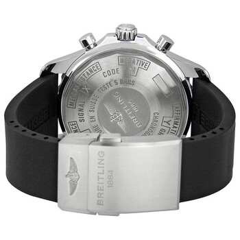Stainless steel case with a black rubber strap. Bidirectional stainless steel bezel. Black dial with luminous hands and dot hour markers. Minute markers. Miles / kilometer conversion scale. Perpetual calendar. Superquartz movement. Scratch resistant sapphire crystal. Solid case back. Case diameter: 48 mm. Case thickness: 15.20 mm. Deployment clasp. Water resistant at 50 meters/ 165 feet. Functions: hours, minutes, seconds, calendar, chronograph, alarm, 2nd time zone, utc universal time, countdown timer. Breitling ChronoSpace Volcano.