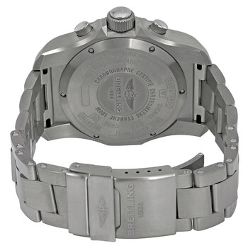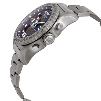 Grey titanium case with a grey titanium bracelet. Bi-directional rotating grey titanium bezel. Blue dial with luminous silver-tone hands and Arabic numeral hour markers. Minute markers around the outer rim. Dial Type: Analog-digital. Luminescent hands and markers. Perpetual calendar digital. Chronograph - sub-dials displaying: digital. Breitling Calibre 50 quartz movement. Scratch resistant sapphire crystal. Screw locked crown. Solid case back. Round case shape. Case size: 46 mm. Deployment clasp. Water resistant at 100 meters / 330 feet. Functions: perpetual calendar, year, date, day, hour, minute, second, chronograph, alarm, digital minute repeater, GMT, countdown timer, power reserve indicator. Luxury watch style. Watch label: Swiss Made. Breitling Cockpit B50 Blue Dial Titanium Quartz Men's Watch EB501019/C904TI.