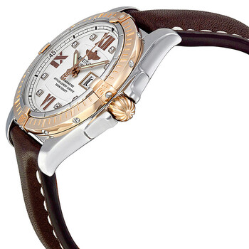 Stainless steel case with a brown leather strap. Uni-directional 18kt rose gold bezel. White dial with rose gold-tone hands and diamond hour markers. Roman numerals mark the 6, 9 and 12 o'clock positions. Minute markers around the outer rim. Dial Type: Analog. Luminescent hands and markers. Date display appears at the 3 o'clock position. Automatic movement. Scratch resistant sapphire crystal. Screw locked crown. Solid case back. Case diameter: 41 mm. Case thickness: 14 mm. Round case shape. Band width: 16 mm. Band length: 8.25 inches. Tang clasp. Water resistant at 100 meters / 330 feet. Functions: date, hour, minute, second. Luxury watch style. Breitling Cockpit Diamond Rose Gold Automatic Men's Watch C4935012-A672BRLT.