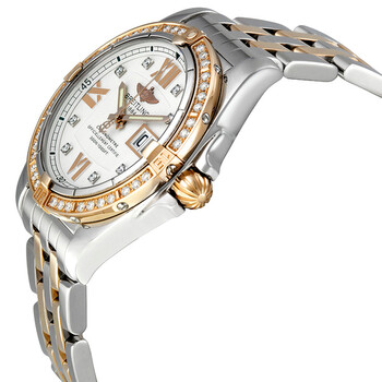 Stainless steel and 18k rose gold case with a stainless steel and 18k rose gold bracelet. Uni-directional rotating set with diamonds bezel. White dial with rose gold-tone hands and diamond with Roman numerals at the 6, 9 and 12 o'clock positions hour markers. Minute markers around the outer rim. Dial Type: Analog. Luminescent hands and markers. Date display appears at the 3 o'clock position. Automatic movement. Breitling calibre 49 engine with about 42 hours power reserve. Scratch resistant sapphire crystal. Screw down crown. Solid case back. Case diameter: 41 mm. Case thickness: 14 mm. Round case shape. Band width: 16 mm. Fold over with safety clasp. Water resistant at 100 meters / 330 feet. Functions: date, hour, minute, second. Luxury watch style. Breitling Cockpit Diamond Rose Gold Men's Watch C4935053-A672TT.