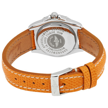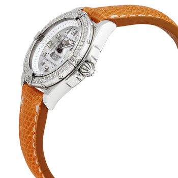 Silver-tone stainless steel case with a orange lizard leather strap. Fixed bezel with diamond set. Mother of pearl dial with silver-tone hands. Dial Type: Analog. Date display at the 3 o'clock position. Quartz movement. Scratch resistant sapphire crystal. Solid case back. Round case shape, case size: 31.8 mm. Water resistant at 100 meters / 330 feet. Functions: date, hour, minute, second. Cockpit Galactic Series. Luxury watch style. Watch label: Swiss Made. Breitling Cockpit Galactic Quartz Diamond Ladies Watch A7135653/A582.125Z.A14.