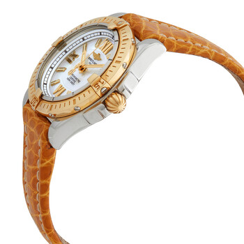Silver-tone 18kt yellow gold and stainless steel case with a orange lizard leather strap. Uni-directional rotating gold-tone 18kt yellow gold bezel. Silver dial with gold-tone hands and stick hour markers. Roman numerals mark the 6, 9 and 12 o'clock positions. Minute markers around the outer rim. Dial Type: Analog. Luminescent hands and markers. Date display at the 3 o'clock position. Breitling Calibre 71 quartz movement. Scratch resistant sapphire crystal. Pull / push crown. Solid case back. Round case shape, case size: 31.8 mm. Band width: 16 mm. Tang clasp. Water resistant at 100 meters / 330 feet. Functions: date, hour, minute, second, chronometer. Cockpit Lady Series. Luxury watch style. Watch label: Swiss Made. Breitling Cockpit Lady Quartz Chronometer Silver Dial Ladies Watch C7135612/A658.125Z.A14BA.1.