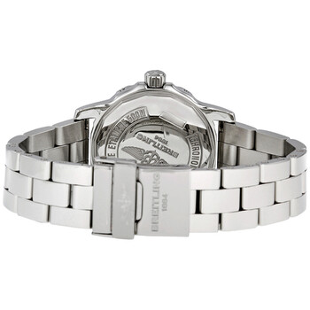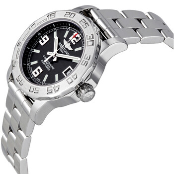 Stainless steel case with a stainless steel bracelet. Uni-directional rotating stainless steel bezel. Black dial with silver-tone hands and stick hour markers. Arabic numerals at the 6, 9, and 12 o'clock positions. Minute markers around the outer rim. Dial Type: Analog. Luminescent hands and markers. Date display appears at the 3 o'clock position. Quartz movement. Scratch resistant sapphire crystal. Screw locked crown. Solid case back. Case diameter: 33 mm. Case thickness: 11.6 mm. Fold over clasp with safety release. Water resistant at 500 meters / 1640 feet. Functions: date, hour, minute, second. Luxury watch style. Breitling Colt 33 Black Stainless Steel Ladies Watch A7738711-BB51SS.
