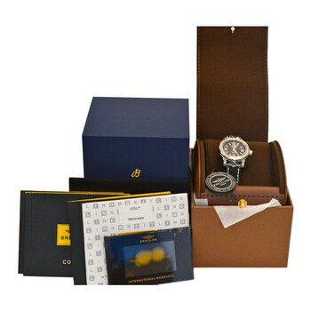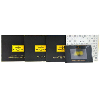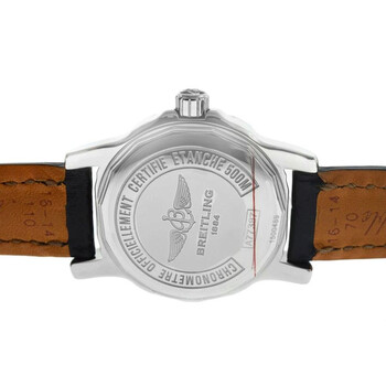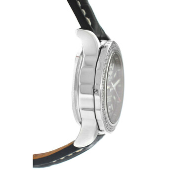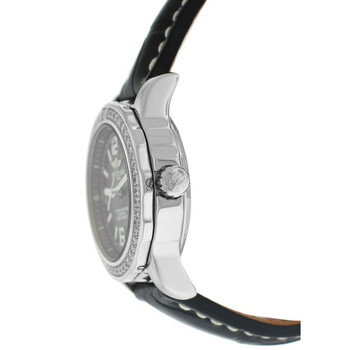 Silver-tone stainless steel case with a black leather strap. Uni-directional rotating silver-tone bezel with diamond set stainless steel. Black dial with silver-tone hands and Arabic & index hour markers. Minute markers around the outer rim. Dial Type: Analog. Luminescent hands and markers. Date display at the 3 o'clock position. Breitling Calibre 77 quartz movement. Scratch resistant sapphire crystal. Screw down crown. Solid case back. Round case shape, case size: 33 mm, case thickness: 12 mm. Water resistant at 500 meters / 1650 feet. Functions: date, hour, minute, second, chronometer. Colt 33 Series. Dive watch style. Watch label: Swiss Made. Breitling Colt 33 Quartz Chronometer Diamond Black Dial Ladies Watch A7738753/BB51-777P.