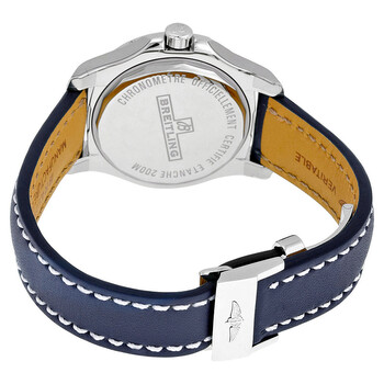 Stainless steel case with a blue leather strap. Uni-directional rotating stainless steel bezel. Blue dial with luminous silver-tone hands and index hour markers. Arabic numerals mark the 6, 9 and 12 o'clock positions. Minute markers. 1/100th markers around the outer rim. Dial Type: Analog. Luminescent hands and markers. Date display at the 3 o'clock position. Quartz movement. Scratch resistant sapphire crystal. Screw locked crown. Solid case back. Case diameter: 36 mm. Case thickness: 10.20 mm. Round case shape. Band width: 16 mm / 18 mm. Deployment clasp. Water resistant at 200 meters / 660 feet. Functions: date, hour, minute, second. Luxury watch style. Watch label: Swiss Made. Item Variations: A7438911/C913 199X-A16D.1. Breitling Colt 36 Blue Dial Blue Leather Quartz Ladies Watch A7438911-C913BLLD.