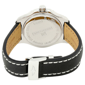 Stainless steel case with a black leather strap. Uni-directional rotating stainless steel bezel. Black dial with luminous silver-tone hands and index hour markers. An Arabic numeral appears at the 12 o'clock position. 24 hour markers. Minute markers. 1/100th second markers around the outer rim. Dial Type: Analog. Luminescent hands and markers. Date display at the 3 o'clock position. Breitling 17 automatic movement with a 40-hour power reserve. Scratch resistant sapphire crystal. Screw locked crown. Solid case back. Case size: 41 mm. Case thickness: 10.7 mm. Round case shape. Band width: 18 mm / 20 mm. Deployment clasp. Water resistant at 200 meters / 660 feet. Functions: date, hour, minute, second. Luxury watch style. Breitling Colt 41 Automatic Black Dial Men's Watch A1731311-BE90-429X-A18D.1.