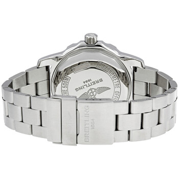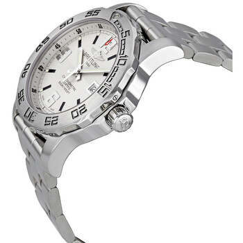 Stainless steel case with a stainless steel bracelet. Uni-directional rotating stainless steel bezel. Silver dial with luminous hands and index hour markers. Arabic numerals mark the 6, 9 and 12 o'clock positions. Minute markers around the outer rim. Dial Type: Analog. Luminescent hands and markers. Date display appears at the 3 o'clock position. Superquartz movement. Scratch resistant sapphire crystal. Screw-locked crown - two gaskets. Solid case back. Case diameter: 44 mm. Case thickness: 14 mm. Band width: 22 mm / 20 mm. Deployment clasp. Water resistant at 500 meter/ 1650 feet. Functions: hours, minutes, seconds, date. Luxury watch style. Watch label: Swiss Made. Breitling Colt 44 Silver Dial SuperQuartz Steel Men's Watch A7438710-G743SS.