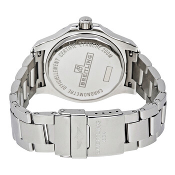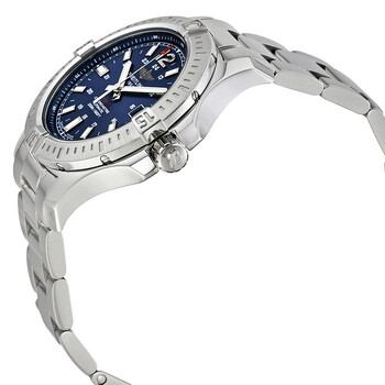 Silver-tone polished stainless steel case with a silver-tone polished stainless steel bracelet. Uni-directional rotating silver-tone stainless steel bezel. Blue dial with luminous silver-tone hands and index hour markers. Arabic numeral appears at the 12 o'cllock position. 24 hour markers. minute markers. 1/100th markers around the outer rim. Dial Type: Analog. Luminescent hands and markers. Date display at the 3 o'clock position. Breitling Calibre 17 automatic movement with a 42-hour power reserve. Scratch resistant sapphire crystal. Screw locked crown. Solid case back. Round case shape, case size: 41 mm, case thickness: 10.70 mm. Band width: 20 mm. Water resistant at 200 meters / 660 feet. Functions: chronometer, date, hour, minute, second. Luxury watch style. Watch label: Swiss Made. Breitling Colt Automatic Blue Dial Men's Watch A1731311/C934-182A.