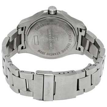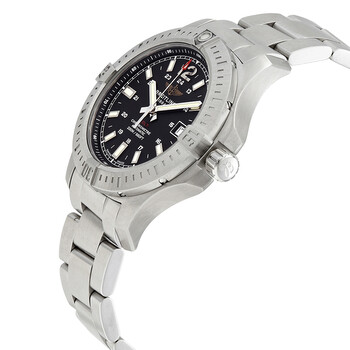 Stainless steel case with a stainless steel bracelet. Uni-directional rotating stainless steel bezel. Black dial with luminous silver-tone hands and index hour markers. An Arabic numeral appears at the 12 o'clock position. 24 hour markers. Minute markers. 1/100th second markers around the outer rim. Dial Type: Analog. Luminescent hands and markers. Date display at the 3 o'clock position. Breitling calibre 17 automatic movement, based upon ETA 2824-2, containing 25 Jewels, bitting at 28800 vph, and has a power reserve of approximately 42 hours. Scratch resistant sapphire crystal. Screw locked crown. Solid case back. Round case shape. Case size: 41 mm. Case thickness: 12.4 mm. Band width: 20 mm / 18 mm. Fold over clasp. Water resistant at 200 meters / 660 feet. Functions: date, hour, minute, second, chronometer. Luxury watch style. Watch label: Swiss Made. Breitling Colt Automatic Chronometer Black Dial Watch A17313101B1A1.