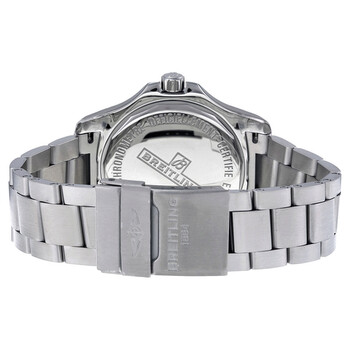 Stainless steel case with a stainless steel bracelet. Uni-directional rotating stainless steel bezel. Marine blue dial with luminous hands and index hour markers. An Arabic numeral marks the 12 o'clock position. 24 hour markers. Minute markers. 1/100th second scale around the outer rim. Dial Type: Analog. Luminescent hands and markers. Date display at the 3 o'clock position. Automatic movement with a 42-hour power reserve. Scratch resistant sapphire crystal. Screw locked crown. Solid case back. Case diameter: 44 mm. Case thickness: 11.25 mm. Round case shape. Band width: 22 mm. Deployment clasp. Water resistant at 200 meters / 660 feet. Functions: date, hour, minute, second. Luxury watch style. Watch label: Swiss Made. Breitling Colt Automatic Marine Blue Dial Stainless Steel Men's Watch A1738811-C906SS.