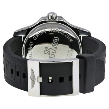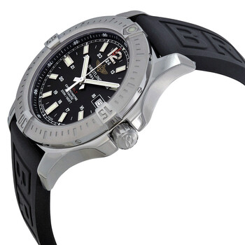 Stainless steel case with a black (Diver Pro III) rubber strap. Uni-directional rotating stainless steel bezel. Black dial with luminous silver-tone hands and index hour markers. An Arabic numeral marks the 12 o'clock position. 24 hour markers. Minute markers. 1/100th second scale around the outer rim. Dial Type: Analog. Luminescent hands and markers. Date display at the 3 o'clock position. Breitling calibre 17 automatic movement with a 42-hour power reserve. Scratch resistant sapphire crystal. Screw locked crown. Solid case back. Case size: 44 mm. Case thickness: 11.25 mm. Round case shape. Band width: 22-20 mm. Tang clasp. Water resistant at 200 meters / 660 feet. Functions: date, hour, minute, second, 24 hour. Luxury watch style. Watch label: Swiss Made. Item Variations: A1738811 BD44BKPT3, A1738811.BD44BKPT3, A1738811BD44BKPT3. Breitling Colt Automatic Men's Watch A1738811-BD44BKPT3.