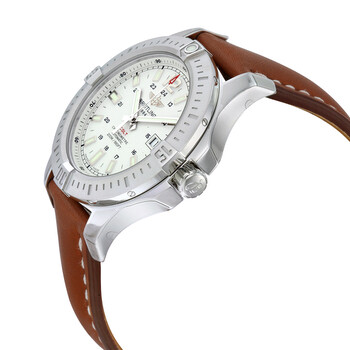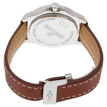 Stainless steel case with a brown leather strap. Uni-directional rotating stainless steel bezel. Silver dial with luminous silver-tone hands and Arabic numeral hour markers. 24 hour markers.minute markers. 1/100th second markers around the outer rim. Dial Type: Analog. Luminescent hands and markers. Date display at the 3 o'clock position. Breitling Calibre 17 automatic movement with a 42-hour power reserve. Scratch resistant sapphire crystal. Screw locked crown. Solid case back. Case size: 44 mm. Case thickness: 11.25 mm. Round case shape. Band width: 22-20 mm. Deployment clasp. Water resistant at 200 meters / 660 feet. Functions: chronometer, date, hour, minute, second. Luxury watch style. Watch label: Swiss Made. Item Variations: A1738811/G791 434X-A20D.1. Breitling Colt Automatic Silver Dial Men's Watch A1738811-G791BRLD.