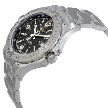 Stainless steel case with a stainless steel bracelet. Uni-directional rotating stainless steel bezel. Black dial with luminous hands and index hour markers. Arabic numerals mark the 6, 9 and 12 o'clock positions. 24 hour markers. Minute markers. 1/100th markings around the outer rim. Dial Type: Analog. Luminescent hands and markers. Date display at the 3 o'clock position. Breitling calibre 74 SuperQuartz movement. Scratch resistant sapphire crystal. Screw locked crown. Solid case back. Case size: 44 mm. Case thickness: 11.9 mm. Round case shape. Band width: 22 mm. Band length: 8.5 inches. Deployment clasp. Water resistant at 500 meters / 1650 feet. Functions: date, hour, minute, second. Luxury watch style. Watch label: Swiss Made. Breitling Colt Black Dial Stainless Steel Men's Watch A7438811-BD45SS.