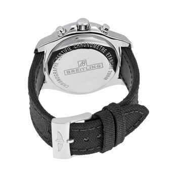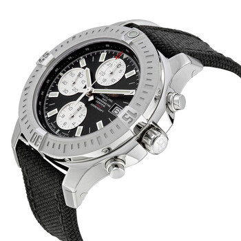 Stainless steel case with a military black fabric strap. Uni-directional rotating stainless steel bezel. Black dial with luminous silver-tone hands and index hour markers. Minute markers. Tachymeter around the outer rim. Dial Type: Analog. Luminescent hands and markers. Date display at the 3 o'clock position. Chronograph - three sub-dials displaying: 60 second, 30 minute and 12 hour. Automatic movement with a 42 hour power reserve. Scratch resistant sapphire crystal. Screw down crown. Solid case back. Case diameter: 44 mm. Case thickness: 14.70 mm. Round case shape. Band width: 20 mm / 22 mm. Tang clasp. Water resistant at 200 meters / 660 feet. Functions: chronograph, date, hour, minute, second. Additional Info: a1338811/bd83 103w-a20basa.1. Luxury watch style. Watch label: Swiss Made. Breitling Colt Chronograph Automatic Black Dial Military Strap Men's Watch A1338811-BD83BKFT.