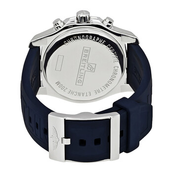Stainless steel case with a blue (diver pro III) rubber strap. Uni-directional rotating stainless steel bezel. Blue dial with luminous silver-tone hands and index hour markers. Minute markers. Tachymeter markings around the outer rim. Dial Type: Analog. Luminescent hands and markers. Date display between the 4 and 5 o'clock positions. Three sub-dials displaying: 60 second, 1/10th second and 12 hour. Breitling calibre 73 quartz movement. Scratch resistant sapphire crystal. Screw locked crown. Solid case back. Case size: 44 mm. Case thickness: 11.90 mm. Round case shape. Band width: 22 mm / 20 mm. Tang clasp. Water resistant at 200 meters / 660 feet. Functions: chronograph, tachymeter, date, hour, minute, second. Luxury watch style. Watch label: Swiss Made. Breitling Colt Chronograph Men's Watch A7338811-C905-158S-A20SS.1.