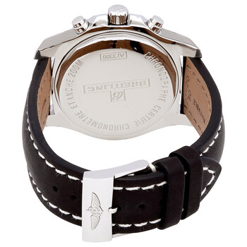 Stainless steel case with a black (calfskin) leather strap. Uni-directional rotating stainless steel bezel. Volcano black dial with luminous silver-tone hands and index hour markers. Minute markers. Tachymeter markings around the outer rim. Dial Type: Analog. Luminescent hands and markers. Date display between the 4 and 5 o'clock positions. Chronograph - three silver sub-dials displaying: 60 second, 12 hour and 1/10th of a second. Quartz movement. Scratch resistant sapphire crystal. Screw locked crown. Solid case back. Round case shape. Case size: 44 mm. Case thickness: 11.9 mm. Band width: 22 mm. Deployment clasp. Water resistant at 200 meters / 660 feet. Functions: chronograph, date, hour, minute, second. Luxury watch style. Watch label: Swiss Made. Breitling Colt Chronograph Quartz Black Dial Men's Watch A73388111B1X1.