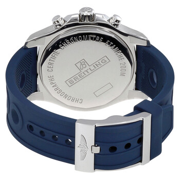 Stainless steel case with a blue (ocean racer) rubber strap. Uni-directional rotating stainless steel bezel. Silver dial with luminous silver-tone hands and index hour markers. Minute markings. Tachymeter markings around the outer rim. Dial Type: Analog. Luminescent hands and markers. Date display between the 4 and 5 o'clock positions. Chronograph - three blue sub-dials displaying: 60 second, 12 hour and 1/10th of a second. Breitling calibre 73 quartz movement. Scratch resistant sapphire crystal. Screw locked crown. Solid case back. Case size: 44 mm. Case thickness: 11.9 mm. Round case shape. Band width: 22 mm / 20 mm. Tang clasp. Water resistant at 200 meters / 660 feet. Functions: chronograph, tachymeter, date, hour, minute, second. Luxury watch style. Watch label: Swiss Made. Breitling Colt Chronograph Silver Dial Men's Watch A7338811-G790BLORT.