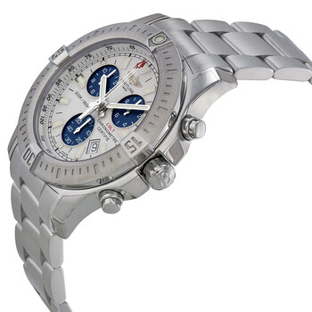 Stainless steel case with a stainless steel bracelet. Uni-directional rotating stainless steel bezel. Silver dial with luminous hands and index hour markers. Minute markers. Tachymeter around the outer rim. Dial Type: Analog. Luminescent hands and markers. Date display between 4 and 5 o'clock positions. Chronograph - three blue sub-dials displaying: 60 second, 12 hour and 1/10th of a second. Quartz movement. Scratch resistant sapphire crystal. Screw locked crown. Solid case back. Case diameter: 44 mm. Round case shape. Band width: 20 mm / 22 mm. Deployment clasp. Water resistant at 300 meters / 1000 feet. Functions: chronograph, tachymeter, date, hour, minute, second. Luxury watch style. Watch label: Swiss Made. Breitling Colt Chronograph Silver Dial Stainless Steel Men's Watch A7338811-G790SS.