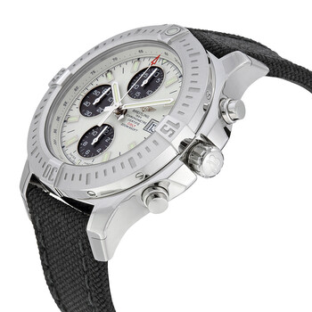 Stainless steel case with a military black fabric strap. Uni-directional rotating stainless steel bezel. Stratus silver dial with luminous silver-tone hands and index hour markers. Minute markers. Tachymeter markings around the outer rim. Dial Type: Analog. Luminescent hands and markers. Date display at the 3 o'clock position. Chronograph - three sub-dials displaying: 60 second, 30 minute and 12 hour. Automatic movement with a 42 hour power reserve. Scratch resistant sapphire crystal. Screw down crown. Solid case back. Case diameter: 44 mm. Case thickness: 14.70 mm. Round case shape. Band width: 22 mm / 20 mm. Tang clasp. Water resistant at 200 meters / 660 feet. Functions: chronograph, tachymeter, date, hour, minute, second. Additional Info: a1338811/bd83 103w-a20basa.1. Luxury watch style. Watch label: Swiss Made. Item Variations: A1338811/G804 103W-A20BASA.1. Breitling Colt Chronograph Stratus Automatic Silver Dial Men's Watch A1338811-G804BKFT.
