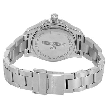 Stainless steel case with a stainless steel bracelet. Uni-directional rotating set with diamonds bezel. Black dial with silver-tone hands and index hour markers. Arabic numerals mark the 6 and 12 o'clock positions. minute markers. 1/100th markings around the outer rim. Dial Type: Analog. Luminescent hands and markers. Date display at the 3 o'clock position. Quartz movement. Breitling 77 engine. Scratch resistant sapphire crystal. Screw down crown. Solid case back. Case diameter: 33 mm. Round case shape. Fold over with safety clasp. Water resistant at 200 meters / 660 feet. Functions: date, hour, minute, second. Luxury watch style. Watch label: Swiss Made. Breitling Colt Lady Black Dial Stainless Steel Quartz Ladies Watch A7738853/BD46SS.