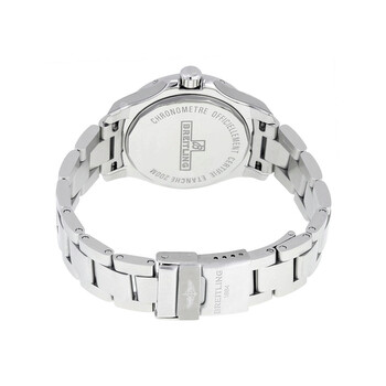 Stainless steel case with a stainless steel bracelet. Uni-directional rotating stainless steel bezel. Mother of pearl dial with luminous silver-tone hands and diamond hour markers. Arabic numerals mark the 6, 9 and 12 o'clock positions. Minute markers. 1/100th seconds markers around the outer rim. Dial Type: Analog. Luminescent hands. Date display at the 3 o'clock position. SuperQuartz movement. Scratch resistant sapphire crystal. Screw locked crown. Solid case back. Case diameter: 33 mm. Case thickness: 9.10 mm. Round case shape. Deployment clasp. Water resistant at 200 meters / 660 feet. Functions: date, hour, minute, second. Luxury watch style. Watch label: Swiss Made. Item Variations: A7738811/A769 175A. Breitling Colt Lady Quartz Mother of Pearl Diamond Stainless Steel Watch A7738811-A769SS.