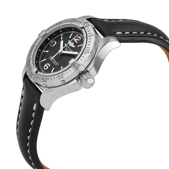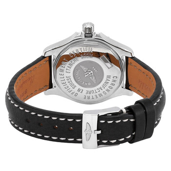 Silver-tone stainless steel case with a black leather strap. Uni-directional rotating silver-tone stainless steel bezel. Black dial with silver-tone hands and index hour markers. Arabic numeral markers at the 6, 9 and 12 o'clock positions. Minute markers around the outer rim. Dial Type: Analog. Luminescent hands and markers. Date display at the 3 o'clock position. Breitling Calibre 74 quartz movement. Scratch resistant sapphire crystal. Screw locked - two gaskets crown. Solid case back. Round case shape, case size: 33.2 mm, case thickness: 11.6 mm. Band width: 22 mm. Tang clasp. Water resistant at 500 meters / 1650 feet. Functions: date, hour, minute, second, chronometer, battery end of life indicator. Colt Oceane II Series. Luxury watch style. Watch label: Swiss Made. Breitling Colt Oceane II Quartz Chronometer Black Dial Ladies Watch A7738011/B785.408X.A14BA.1.